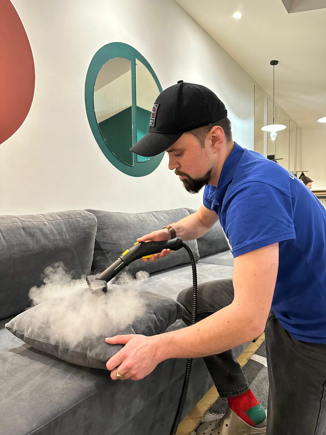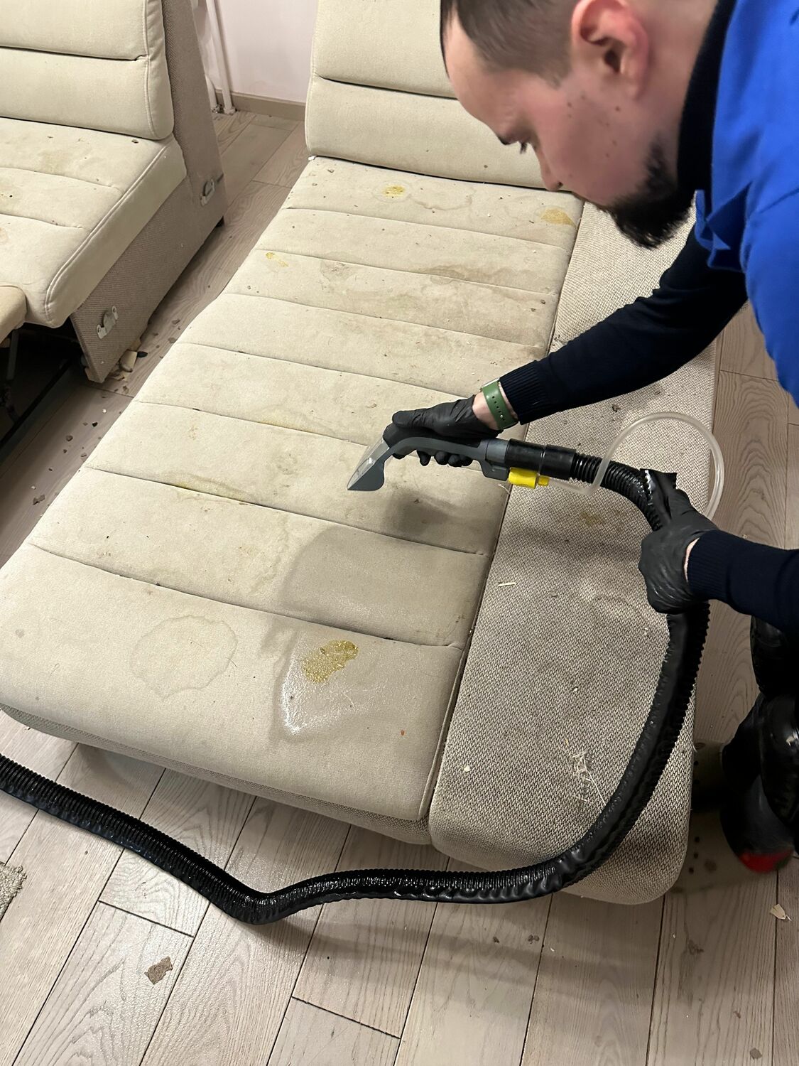 - Экстракторная (глубокая) чистка: Горячая вода с безопасным моющим раствором под давлением проникает вглубь ткани, а мощный отсос мгновенно удаляет грязь. Эффективно для сильных загрязнений и устранения аллергенов.
